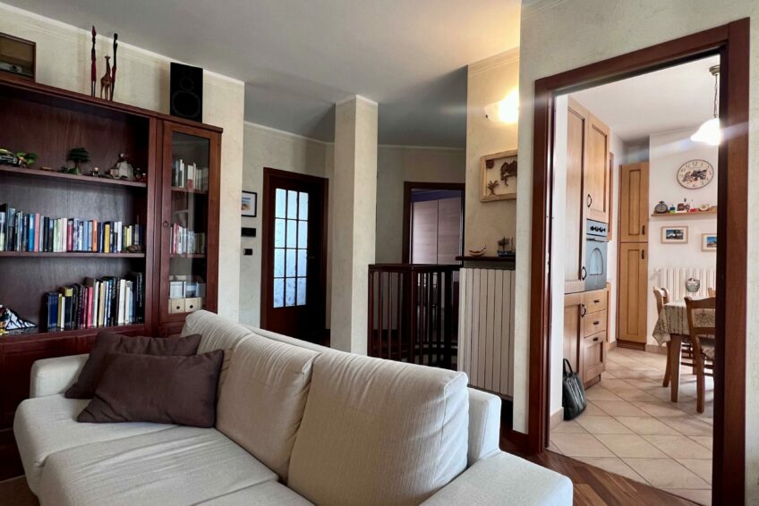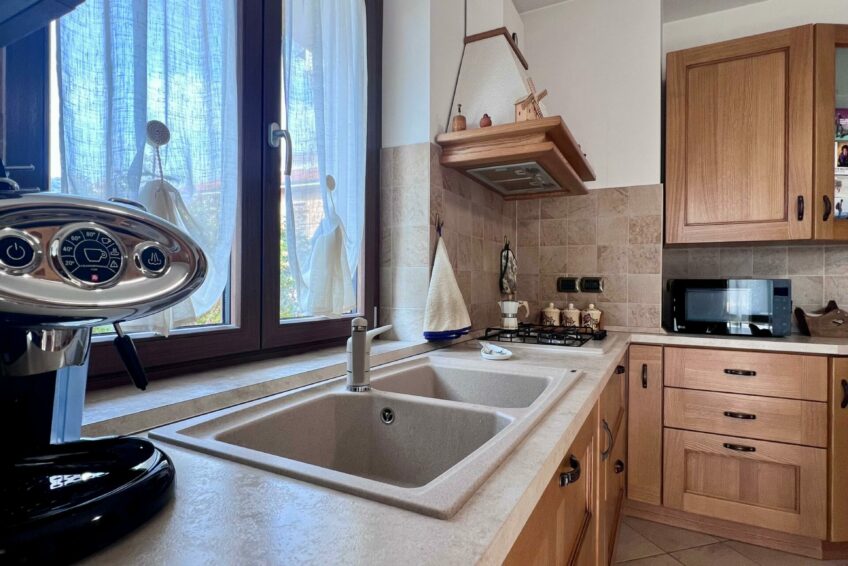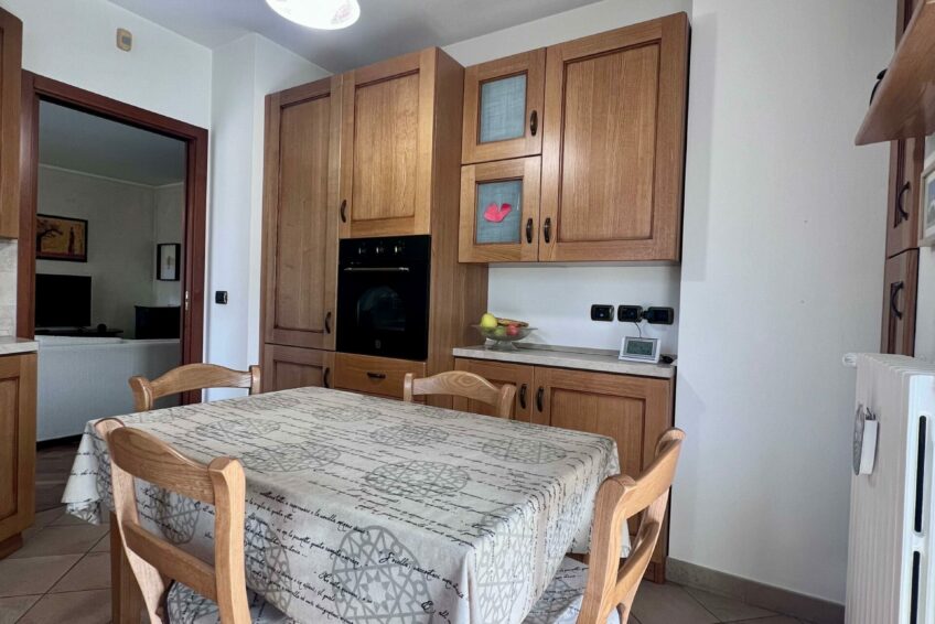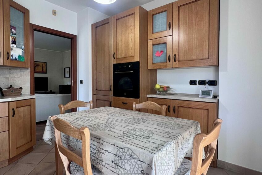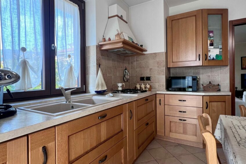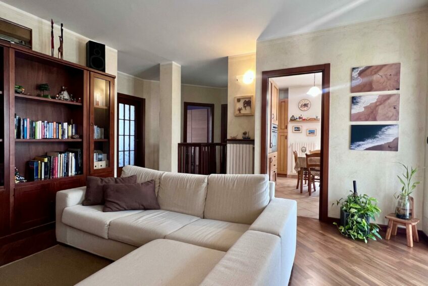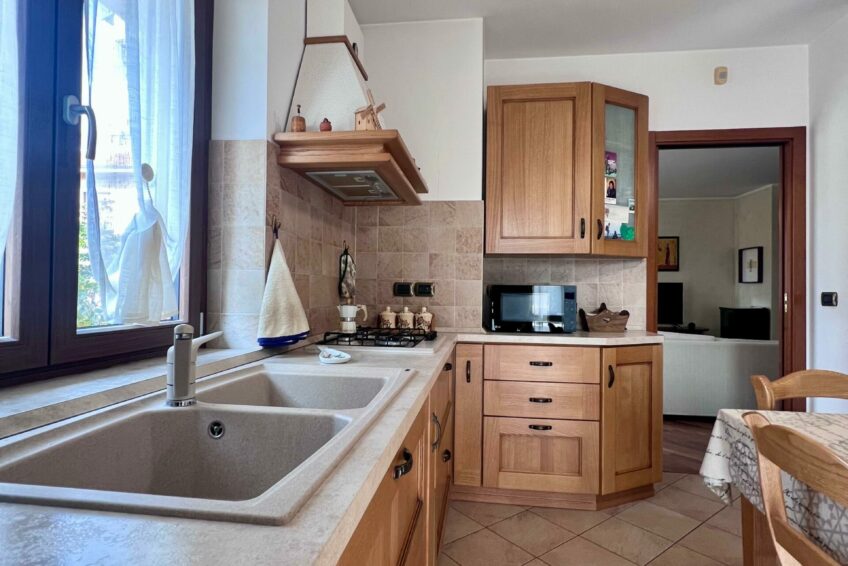 Tramite il portoncino blindato, l’ingresso è living su un accogliente soggiorno, che comunica con la cucina abitabile.
