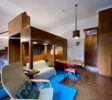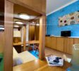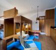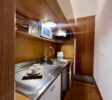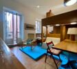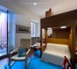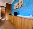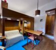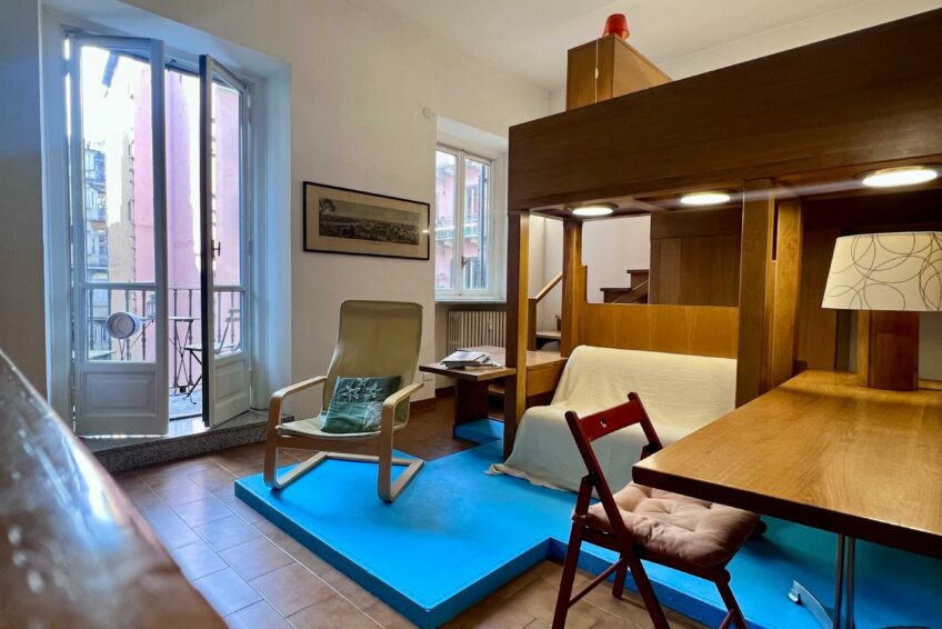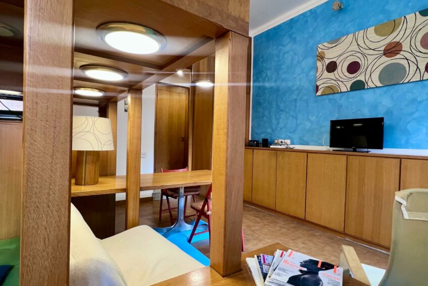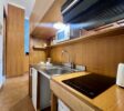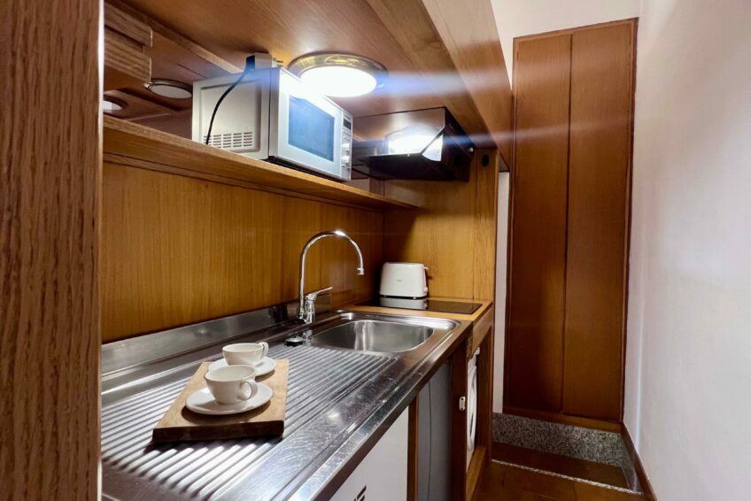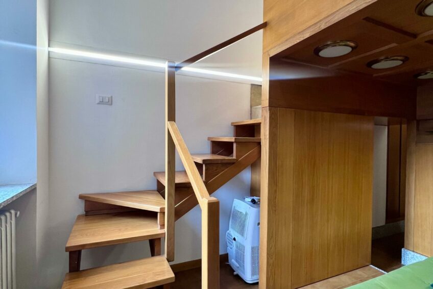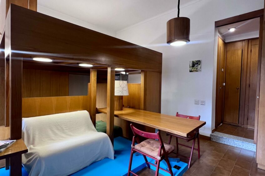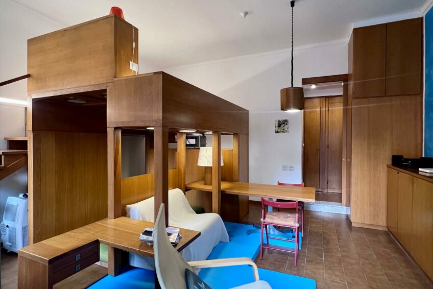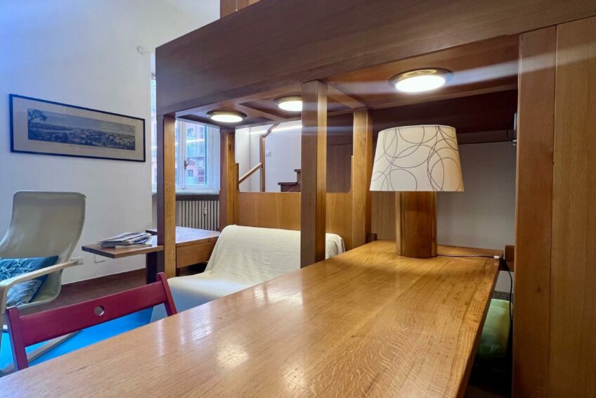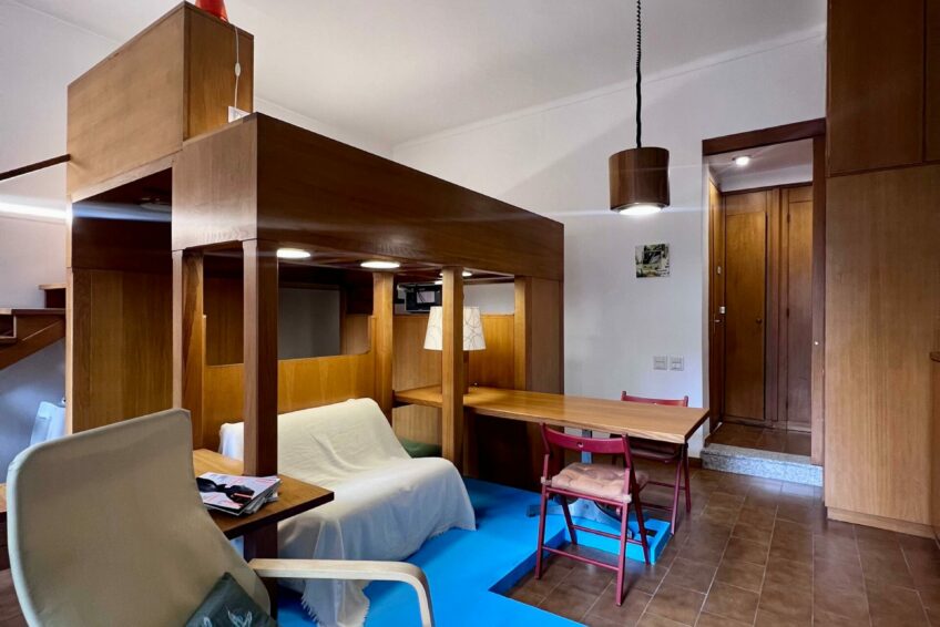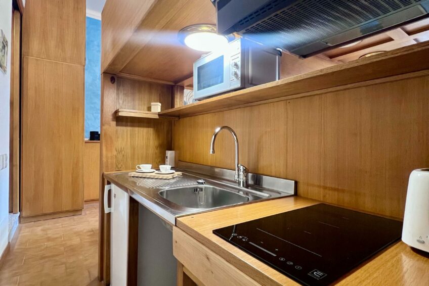 Una funzionale struttura in legno divide l’angolo cottura, dall’angolo living, creando un ulteriore spazio per la sistemazione di un letto singolo.