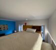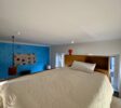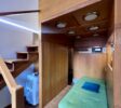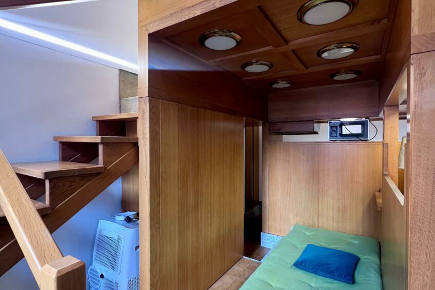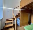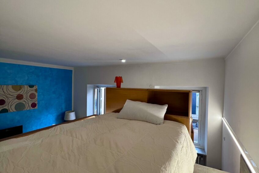 La zona notte con il letto matrimoniale è soppalcata, mentre il bagno è finestrato, dotato di box doccia e boiler elettrico per l’acqua calda.