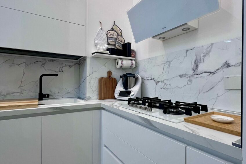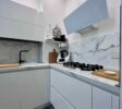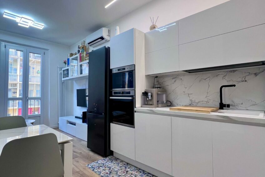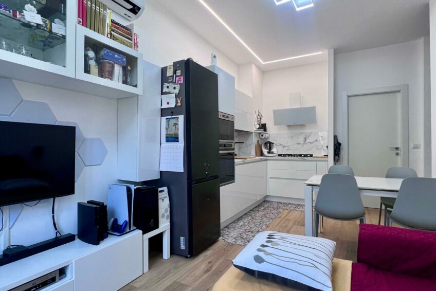 L’ingresso si apre su un comodo disimpegno che accompagna a tutti i locali dell’abitazione: la zona giorno è moderna e versatile, dotata di un’illuminazione a led, di design e innovativa.