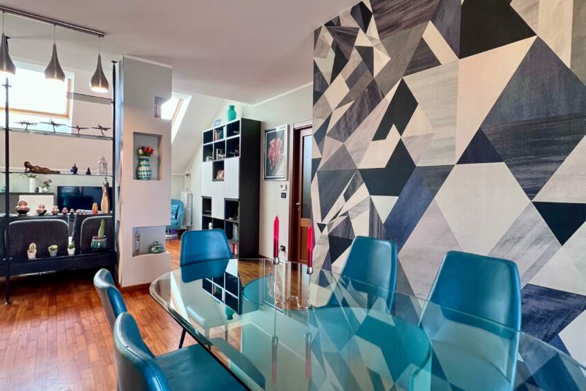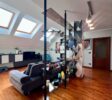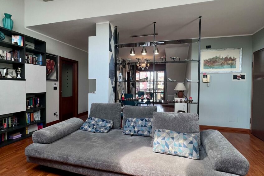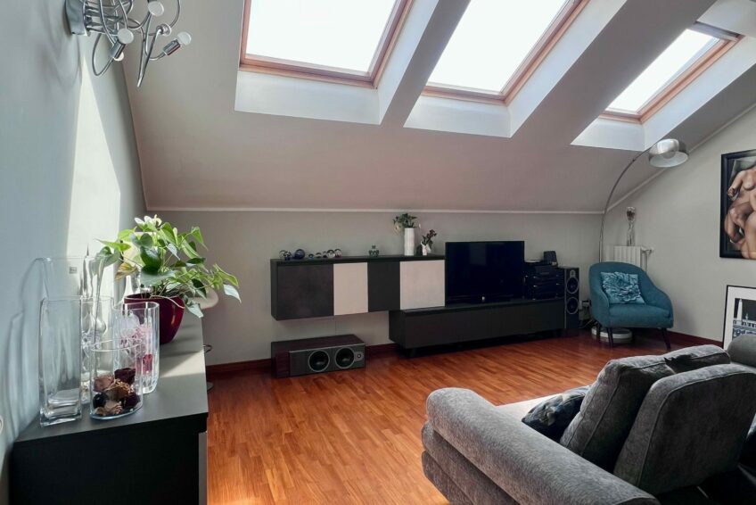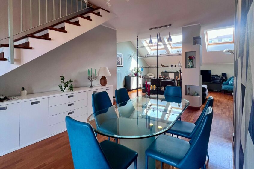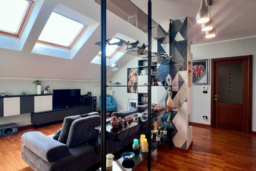 -Al piano inferiore (6° p) una grande sala living molto luminosa grazie alla presenza di tre velux con apertura motorizzata, zona pranzo, una cucina abitabile.